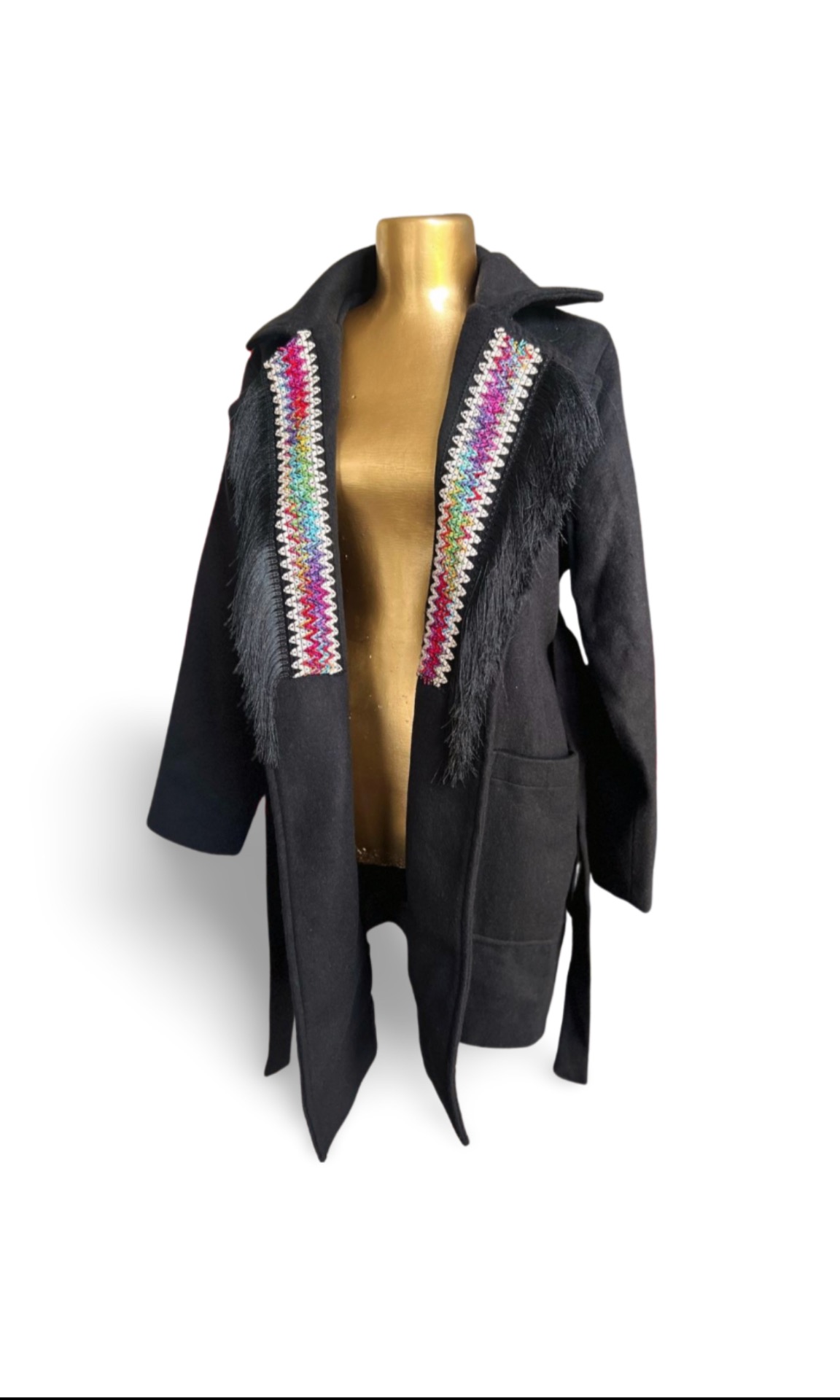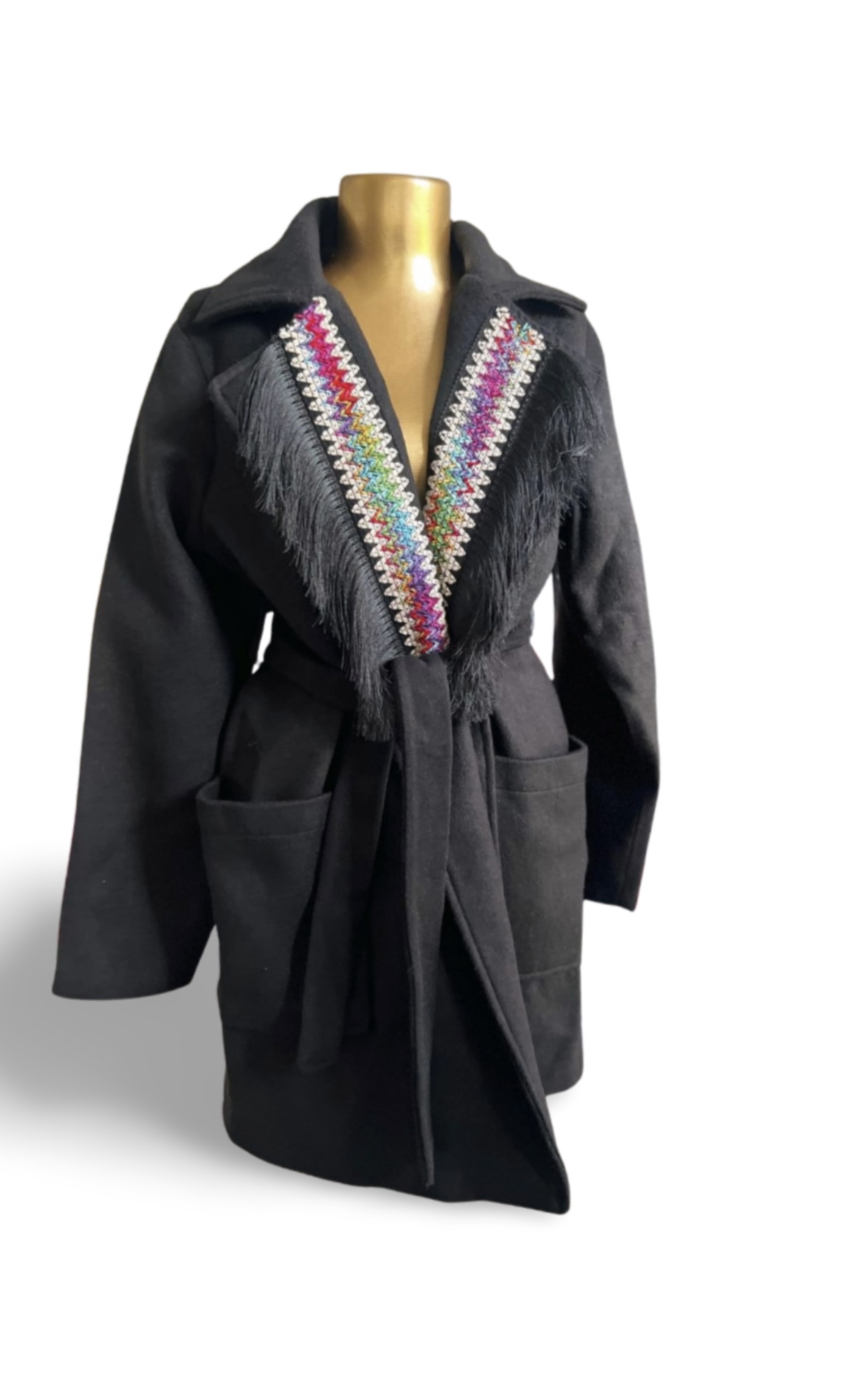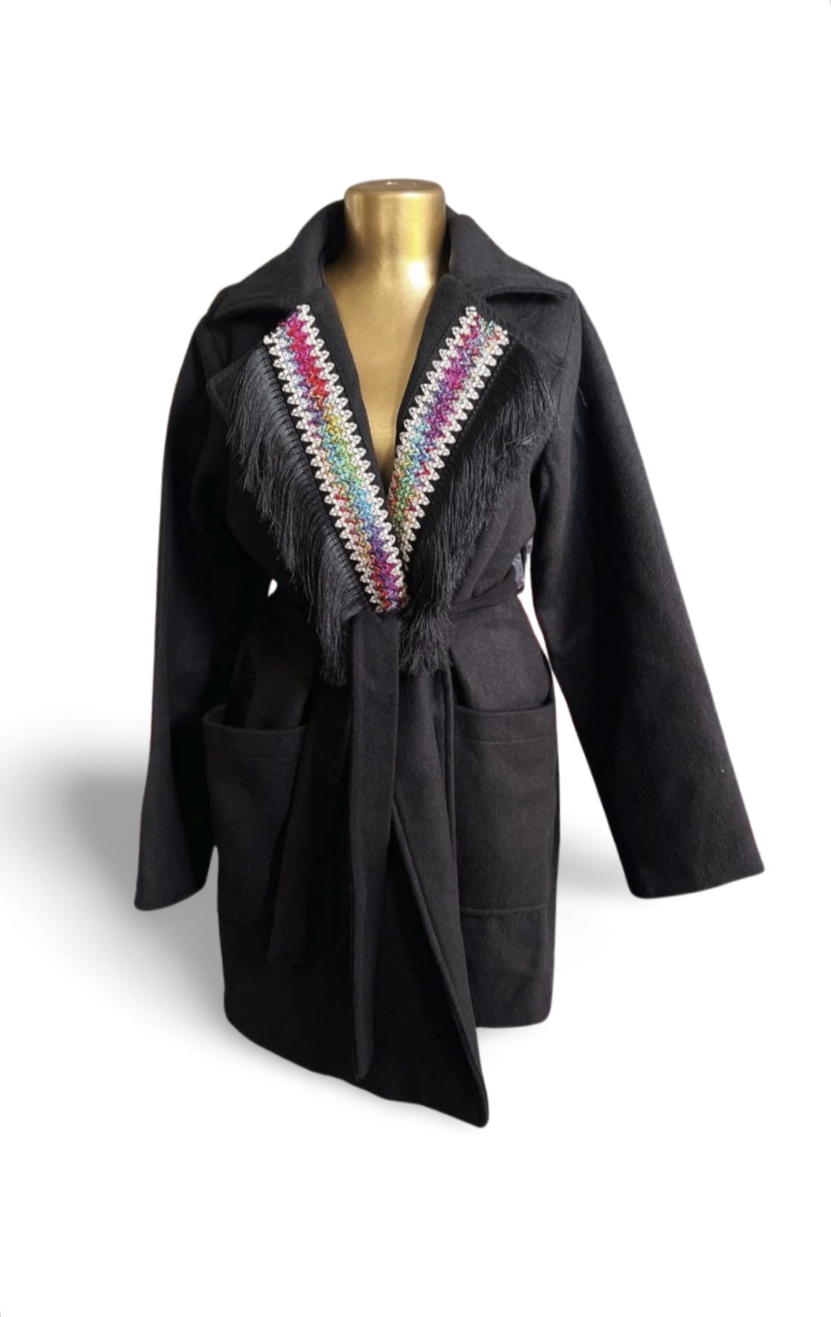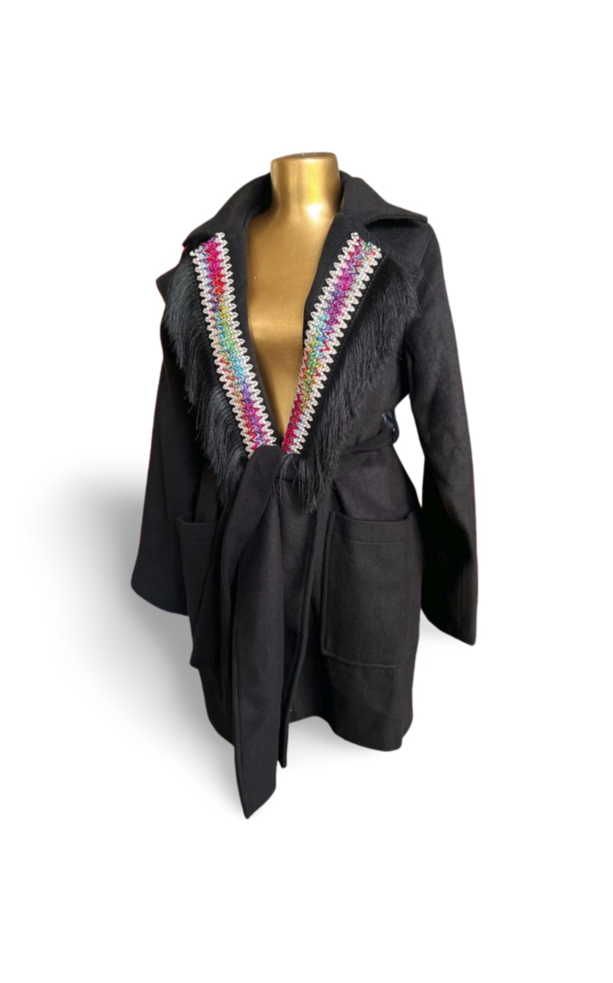 Palton cu model colorat si franjuri, concept unic din material textil poliester si vascoza.Recomandat spalate chimica.Marimi /32/43/46/38/40/42